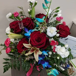 Sad to say, very disappointed. Ordered flowers for my wife for Valentine's Day 2019. There were a couple of things that stood out ...1.) Nothing is perfect, and I wasn't expecting an exact match, recognizing the fine print beforehand, "When you order custom designs, they will be produced as closely as possible to the picture. Please remember that each design is custom made. No two arrangements are exactly alike and color and/or variety substitutions of flowers and containers may be necessary. Prices and availability of seasonal flowers may vary." However, the number of star-gazer lilies in the photo vs. the 3 in the bouquet is surprising, and for over $100, very shocking. Secondly, the received bouquet comprised of a lot of carnations and greenery. Third, roses added, but not pictured originally, were already beginning to wilt. Lastly, blue. Why? It just seemed odd for Valentine's Day.2.) Perhaps I'm wrong, but stem leaves in the water I hear is a big no-no from years of buying flowers as they decay in the water and subsequently shorten the life of the bloom. 3.) Surprised to see that no flower flood was provided to keep the health of the bouquet. Luckily had an extra, re-cut stems, and refreshed the water to keep the roses alive that are wilting faster than the other flowers. I have found flower food to be essential to keeping a bouquet for weeks. What did I learn: 1.) When you order flowers from a distance, you are at the mercy of the florist. Should've done what I always do, build your own bouquet. I honestly could've done better and cheaper at a grocery store. 2.) Don't order flowers to be delivered on a Monday. Probably much like grocery stores you don't want to order after a weekend as more than likely the fresh flowers arrive during the week. 3.) Don't spend over $100 on flowers unless your absolutely sure.