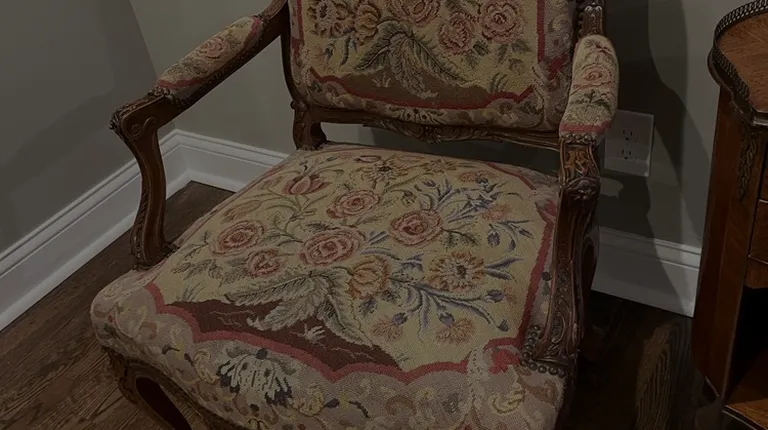 19th CENTURY MAGNIFICENTLY CARVED WITH NEEDLE POINT COVERING DEALER 122 OLD WORLD FINE ANTIQUES