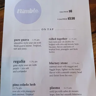 Stopped by Nimble while brewery hopping in the crossroads. The vibe was super chill, a little dark, and calm. None of the beers on the menu grabbed my attention, so I ordered the house sour cocktail. It was strong and delish! Would definitely get it again! Service was great!