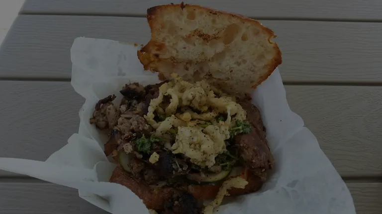 Wowza! Decided on the #1, called the whole porkin' thing. The sandwich is $8.50 and consists of roasted pork on a farm to market ciabatta bun. It also has chimichurri, fried shallots, and topped with buttermilk aoili. The roasted pork was really good. A few bites of the pork were overcooked but mostly it was very tender, juicy, and tasty. The ciabatta bun is really good and meshes perfect with the fried shallots and aoili. Another slight drawback is the aoili. It's really tasty but a little greasy and messy. Don't get it on your clothes or you will have a guaranteed stain. Really good, tasty, filling sandwich though!