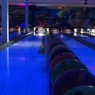 Went here on a double date and got everything I expected from a standard bowling alley. For the four of us to rent one lane for two rounds (took about an hour) and shoes it was $60. A few of us got 300 burgers and fries which always live up to the hype. At 7 they turn off all the normal lights and it turns into a black light zone. There's lots of colorful lights flashing everywhere and loud music which is super fun but potentially overstimulating to some. We got there around 6 when it was semi empty but by the time we left around 7:15 it was packed, so reserve if you can or get there ahead of the crowd. Definitely our go to bowling place!