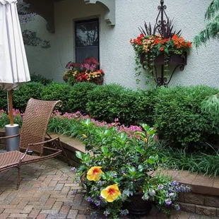 a patio with chairs and a fire pit