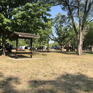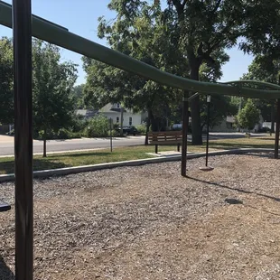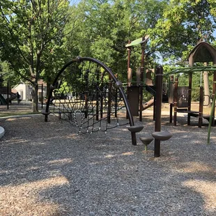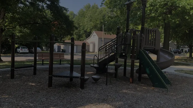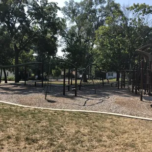 Nice park located right next to the Lenexa Community Center off of Santa Fe. The playground is newer and well maintained. They have 2 playgrounds, one for older kids and one for toddlers. There's a zip line and lots of rope structures to climb on. There are large trees for shade, benches, and covered picnic tables. There aren't any bathrooms on site, but I'm guessing you could pop into the community center and use theirs. Overall, it's a sweet little neighborhood park.
