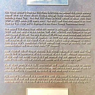A city park 2 blocks west of the Platte City Courthouse and downtown district. It doesn't have a lot going on in regards to amenities other than a large shelter house; no playground, trails or even benches; although it does have 2 features worth checking out. A large anchor from the USS Platte is on display with a plaque describing the naval ships history. A large artillery cannon sets next to it and the small plaza commemorates all that served in the military. The other great feature of the park and why it is so named, is that it overlooks The Platte River where settlers crossed and where once stood a bridge, the stone embankment pillars remain. A great view and walking access to the river is available.