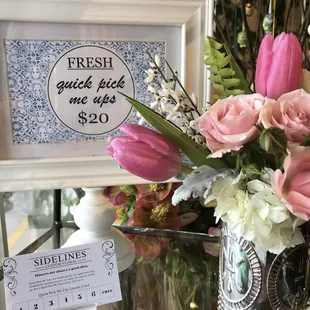 We have been ordering from Sidelines for many years and they consistently deliver the most beautiful flowers and arrangements. I called yesterday for a Mother's Day delivery for today (time got away from me!) and they accommodated me with no problem. They even delivered first thing this morning so my mom will be able to enjoy her flowers at work all day! The arrangements are always seasonal, creative, full and use the freshest blooms. Plus, they have a cute storefront with some fun treasures. Highly recommend Sidelines!