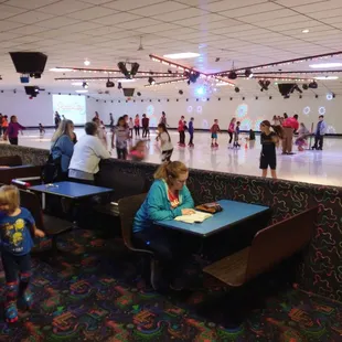 I have been to several skate places in the metro (usually on Saturday/Sunday afternoons), but I have to say that this is the most crowded with kiddos that I have ever seen. This is a great place for you if you have children who are learning to skate, since they have wheeled frames that the kids can lean on while learning. I have never seen anything like this and, as you will see, i am not a big fan (see below).On the other hand, if you are an adult who knows how to skate this is VERY SCARY! Tons of kids and frames on the floor, literally, create a land-mine effect, just waiting to trip you and create some sort of broken/sprained/twisted joint situation that is very unsavory.The music was pop, for the most part, and there were the traditional skate games of limbo and freeze. I did not hit the snack bar, but they appeared to have standard fare. The skates were very nice (clean and new-looking), and they also have in-lines, if that is your thing.I would go back, but just as a warning to those with limited skills or patience, I'd uggest looking in to hitting up the 18 and over events that they have, or you are destined to take a tumble.