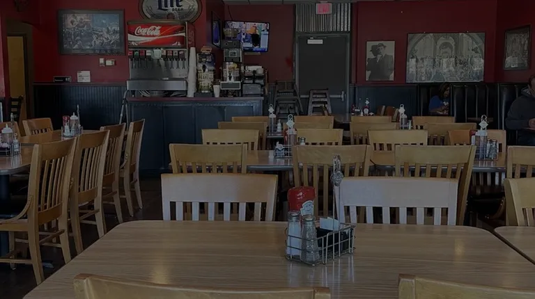 Restaurant seating toward kitchen.