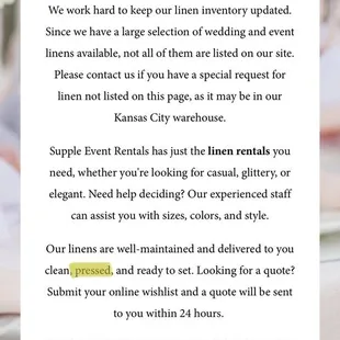 We used Supply Event to rent linens for our engagement party on June 5th. They did not answer our original inquiry via email so we had to call. We picked them up two days before our event (on a Friday, event on a Sunday). When we took them out to place on the tables before our event, we saw they were all extremely wrinkly!! It looked like after they were laundered no one had even attempted to press them (even though the website states they come pressed). It was embarrassing to use them for the party but Supply Event isn't open on the weekends so there was nothing that could be done. When we dropped them off we told the employee the issue and she said we would need to contact Carrie. My fiancé emailed her and called her multiple times and left voicemails before getting a call back saying her phone had died. The phone call was very awkward; she said that shouldn't have happened but it was mostly excuses and she clearly wasn't upset that this happened. She kept repeating the same thing until we interjected saying we needed a full refund. Carrie said she would send the check but she didn't so my fiancé had to call again and she said she would send it this time. We did get it about a month after she first said she would send it. I wouldn't recommend using this business. I'm glad our event was more lowkey but I would have been much more upset had this been our wedding or a more formal event.