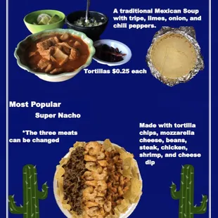 Tacos! Chicken, Chorizo, Lengua, Steak, Shrimp, Shredded Pork, Tripe, as well as Mixed Meat.