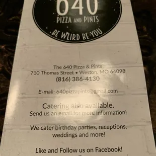 Absolutely fabulous lunch on a beautiful day in Weston. 640 Pizza and Pints has one of the best pizzas I've had here locally. We had a thin crust Meet Me in Weston and it was absolutely delicious. Our friends tried the Home Slice, and raved about the combination of cream cheese, pickles, and pepperoni.Service was so friendly and fast, plus I'm a sucker for anyone smart enough to have Mike's Hot Honey at the table! Didn't get any pictures because we were just enjoying the company of our friends, but I absolutely recommend you check this place out.Meat Me in Weston Pepperoni, sausage, bacon crumbles, Canadian bacon, bell peppers, black olives, red onion, mushrooms and mozzarella cheese.$15.50+The Home Slice Pepperoni, dollops of cream cheese, dill pickles and mozzarella cheese.$14.00+