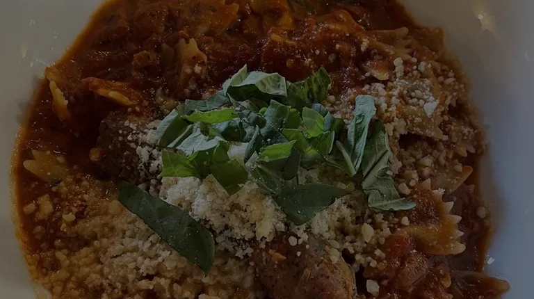 Farfalle pasta with sugu and homemade meatballs and Italian sausage.