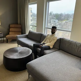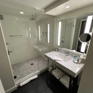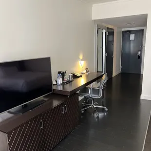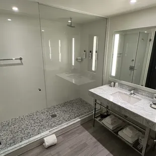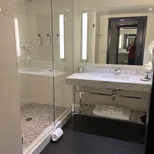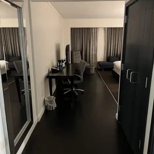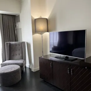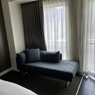 Nice sized rooms. We were on the 4th floor. Small fridge, bottled water , chair & chaise to relax on. The shower is great and plenty of room on the bathroom vanity.We had plenty of room to hang with another couple as the bar was standing room only that night.