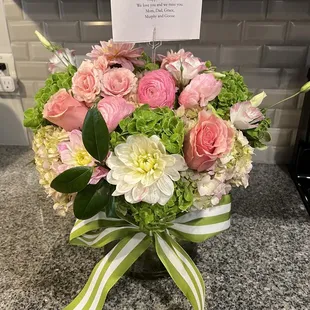 Nailed it! Sending flowers from the Left Coast, so far away, the flowers were gorgeous, delivered quickly and delivered the emotional impact we were hoping for. Reasonable price and beautifully done. Will use them again for sure.