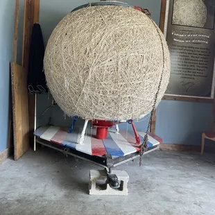 a man and a woman standing in front of a large ball of yarn