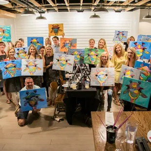 I would like to say that, I would do this again in a heartbeat. It was reasonably priced, $35. They were able to accommodate my party of 5, plus almost 15 others... could have been more. Our teacher though I can't remeber her name (wine) was awesome... she was patient, she helped you when you needed it. It was almost like being in art class in grade school, but with wine, and good background music. We drank, we sang along, we painted, we laughed alot. It was like she was teaching very well behaved, five year olds who had wine. A few tips.. it's BYOB, it doesnt have to be be wine, a lady last night had patron and pineapple juice. Bring some snacks, and bring at least two friends. Its more fun that way!And most importantly, don't stress.. they give you a pre hand drawn template to keep you on track, all you do is add the color and detail!