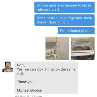 They followed through and were very dependable and reliable. I especially appreciated how detailed they were with explaining everything to me and my washing machine worked beautifully after they were done. I didn't go to them first, which I regretted after I got treated so well by them. I know exactly who to go to next time I have an appliance that needs help!