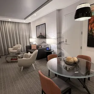 Aria sky suites are my go to in Vegas. Their location within aria is optimal for ubering or taking the tram to other mgm properties. The furnishings are modern and timeless. The private entrance, excellent service, access to priority reservations make this a must for luxury travelers. Arlette at the front desk took excellent care of us and made sure our every need was satisfied. I much prefer aria sky suites to a suite at the Bellagio, which entitles you to far less benefits. The floor to ceiling windows are impressive and so are they two steam showers in every 2 bedroom sky suite. We didn't have time to use the jacuzzi style bath tub, but I recommend asking or requesting a strip as those are disproportionately aesthetic to the Mountain View and if you wake up early or are pulling an all nighter like many do in Vegas you're almost guaranteed a magnificent sunrise. These suites aren't just for entertaining, they are well thought out and provide everyday luxury and comfort for everyday stays.
