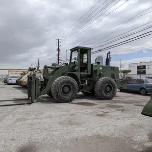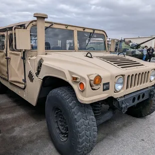 a military vehicle parked in a parking lot