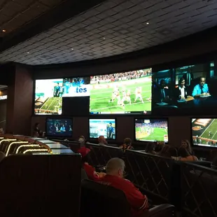 The service at the sports book is terrible. We stayed at the Cosmopolitan and loved it! The service for food and drinks is awful. We watched a hockey game (which I bet on) and saw our server once. That is poor service and planning by the management as the place was full for a Wednesday night. ABSOLUTELY THE WORST SERVICE! Don't watch a game here or eat here unless you want service that is worse than Applebee's. No offense to Applebee's.