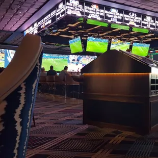 Bartender Cherie took great care of us at the Sports book bar! Its surrounded by large tv's, stat board, sports cashier, bar, desk and chair seating.There also is an electronic derbie horse machine nearby.
