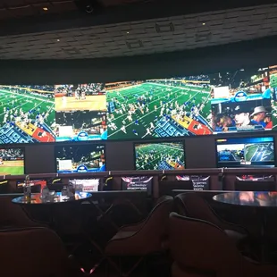 Seating is comfy but limited. It's first come, first to be able to pop a squat (unlike other hotel/resorts that require a reservation...CAESAR'S!!!) which is perfectly fine.Telly's are in abundance and easily viewed from almost any seat. Grab a Pizza by the Slice from Pin Up Pizza or grab an actual table for table service.Placing bets here is simple and if there is no sheet printout, they will get you one. Very nice, helpful staff. Definitely a good place for Sunday Funday!