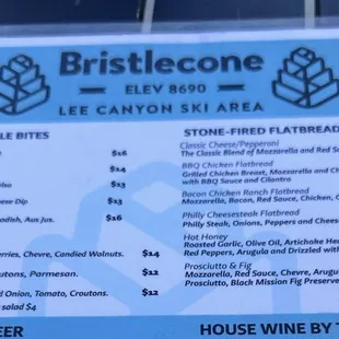 My husband and I drove about an hour to Lee Canyon/Bristlecone to get away from the heat. We sat upstairs on the patio and waited for about 20 minutes before we ordered at the bar. (We arrived around 6pm so understandably busy.)The only food items available were flatbreads.No appetizers or salads. We ordered the Philly cheese flatbread (pictured). I had two bites. The best thing about this place is the gorgeous views and drinks!