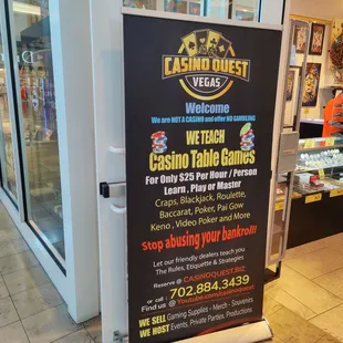 Casino Quest is located at Fashion Show Mall, on the second floor near Dillard's.Inside is spacious with plenty of merchandise such as t-shirts, board games, chips, cards, and funny plaques. There's even gaming supplies for sale. They teach casino games and can also host private events. Pricing for an hour lesson is $25. Lessons include craps, blackjack, roulette, baccarat, and poker. The lessons are engaging and the dealer is very good at showing how to play the game and what to look for. They give plenty of helpful tips!Service from Nathan, Nick, and Alex is welcoming, friendly, and accommodating.