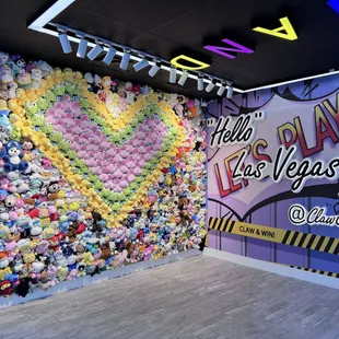 Super cute claw machine arcade!! To play, you pay this machine and it exchanges for tokens to put into the claw machines. We paid $20 for about 23 tokens (?). 1 token = 1 round. There's probably over 30 different claw machines with mostly toy plushies and keychain prizes. Ngl it's pretty hard to win the prizes on the first try. I think the claws are loose and a little scam-like. Whenever we pressed the button, it would grasp the item well but then drop once the claw goes up all the way. I had to play at least 3-5 times before winning a prize. I like that every time you win, all the claw machines in the arcade will light up and play music lol. The plushies are semi cute, they mostly looked like Temu dupes. They have two really cute photo op walls. One that's filled with plushies and forms a giant heart; Second one has 3D letters saying "Hello Las Vegas." Great place for kids and friend gatherings!