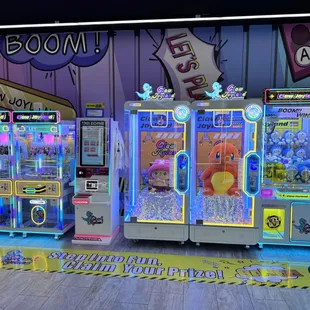 Stumbled upon this place while visiting our favorite restaurants.... It definitely draws you in. Super cute ambiance, lots of flashing lights, clean and colorful. Tokens are reasonable, $10 minimum for 10 tokens, each machine takes 1 token/ play. It was fun but don't expect to win anything. Claws seem really loose but you will have lots of laughs. Customer service could be better, the person working there just stares at you and doesn't say anything so it's a bit uncomfortable. A nice "hey welcome in" or "have a good day" at least would have been nice.