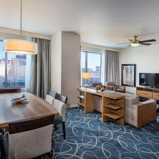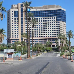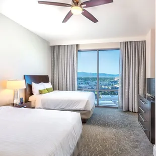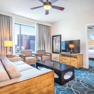 Having previously stayed at the sister property Wyndham Grand Desert, I had some high expectations rolling into the newer Desert Blue.CHECK IN: was pretty efficient, they let me check in at 2 which was well before the 4pm check in which is way too late (IMO) Note: They have you go to another desk to get the wristband if you want it.. that guy called me as soon as I walked in my room. He tried to get me to come back down to that desk and talk to him, which I did not. Dont want the sales pitch.ROOM: Wow, for a studio it was quite commodious! I felt like i had plenty of room and the accommodation was very inviting with the blue colors and we all know blue is extremely a la mode these days. The fridge was smaller and no range but everything else you'd need was right there. Snug accommodations.POOL: I liked this pool area. There were 2 large pools, a splash pad and 2 hot tubs. Other notable mentions was a pool bar & Grill with a larger menu than you'd expect, but the grill closes early. The food is fair to middling as well.This property was a pleasant surprise. No charge for parking, Secure building and the gates around the back and side entrances (Highland dr) make the lots much more secure from people who don't belong wandering or driving in.