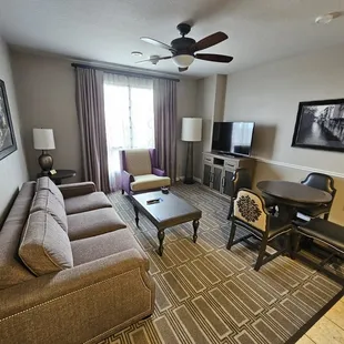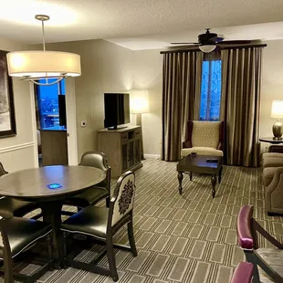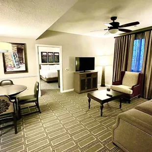 Just off the main strip club Wyndham has great amenities and daily activities. Spent mornings at the pool. Separate kids and adult pool which I was thankful for. Lifeguards on duty watched over all of us having too much fun. Everyone appreciated their presence. There's plenty of lounge chairs. Pool bar guys and cafe servers were awesome. The cafe serves breakfast and lunch alongside Starbucks. If you have the vip wristband you can get the extra discounts when making purchases. The wristbands are also your keyless entry for pool gates, building entry and room key. Standard room has a kitchenette with table for 4 sleeper couch, with separate bedroom. Two TVs, lots of dresser space and large closets. The bathroom was a little on the quaint side maybe in the future these could be remodeled. Was a little lacking. I think the rooms could use an update overall. Some carpet cleaning and new furniture. Just personal preference. On the first night we had to get the sink plunged. It wasn't draining properly but maintenance crew here is awesome! We had a few requests during our weeklong stay and they came promptly and worked efficiently. Overall great service. No loud neighbors or ruckus. Large separate towers so underground parking can get a little confusing or become a hike. But the bellmen come to the rescue if you call for their assistance in the lobby.