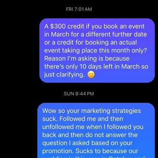 Would never do business with this company at all. Horrible customer service, at least that has been my experience. Firstly they followed me on IG, (of course I followed back considering we are looking for a caterer for our event and I thought it was perfect timing that they reached out) they offered a promotion for a $300 discount if you book an event in March. Mind you they sent me this message on 3/22 so I asked a question in regards to the promo, asking if it could be applied to another event considering there were only 10 days left in March. They left me on seen/read and never responded to my question. That's the weirdest customer service ever because it literally takes 10 seconds to answer a simple question for a potential customer. I gave them the benefit of the doubt and figured maybe they read it and were planning to answer my inquiry later or the next day... nope got left on read a second time lol. To date no one has responded to my question. No clue what went wrong or what I did wrong, but to be so blatantly rude is unacceptable and we do a lot of business with vendors all over Las Vegas. For our wedding we are using several very highly sought after Las Vegas vendors (some they've even worked with before) and have never experienced being ignored... I mean who runs away from money lol? Maybe whomever is in charge of their social media shouldn't be. To date have not heard anything back which is more than okay with me. We found another popular catering company that greeted us with enthusiasm, professionalism and great customer service.