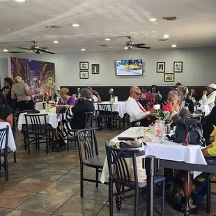 The customer service was good and they were attentive. I don't know if they don't turn on their air or it was not set correctly it was so hot when we got up to leave my backside was all sweaty and wet. It made it hard to enjoy the food.The pricing is about the same as you would find at any other restaurant like this in Vegas.My husband loved the catfish but the greens lacked flavor and tasted like they were out of a can. The gravy on the mashed potatoes tasted like it came from a jar and not homemade. The chicken was really good. It seems their strong suit is their meats. The sweet potatoes were cooked well and had just the right amount of sweetness. The cabbage was disappointing it was bland and so was the meat that was in the sweet potatoes.