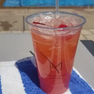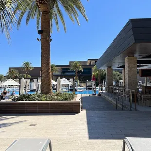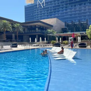 So upbeat! Kids are expected at hotel pools, but it was refreshing to have music, patrons in the pool smiling and sipping on large plastic adult sip cups/ beers with no children crying, screaming or splashing around me. This is an adult pool and it was very relaxing for me. This day people in and out of the pool were happy, but not loud or obnoxiously drunk. This pool is a rectangular style pool that is smaller than the main M pool. There is a hot tub at the end.Kids are fun, but it was nice to have discovered a sanctuary like this.Bring your ID.
