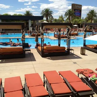 I'm hesitant to give this place five stars because it is a gem and not that crowded and I would hate to see that change! You can actually move around in the pool and the music/DJ is not as overpowering as other pools.We had a bachelorette party here in one of the cabanas and it was just perfect. Our waitress (I think her name was Kris) was so attentive and made the party really fun. She brought us beer pong, kept the drinks cold and refreshed, and was phenomenal when there was a mix up with our food. The cabana was clean complete with a freezer, sink and TV. Obviously you can't bring your own alcohol here but it was a great way to keep our drinks cold. I would definitely come here again and recommend it to others!