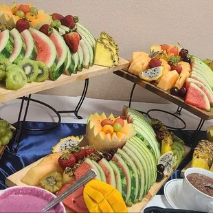 Cheesecake, mousse, fruit tarts, fruit platter, veggie cups, sliders