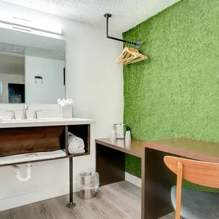 Had a 50s vibe to it. Neat room with walk in shower! Has a lot of room and big tv. Cool golf theme with a quaint bar