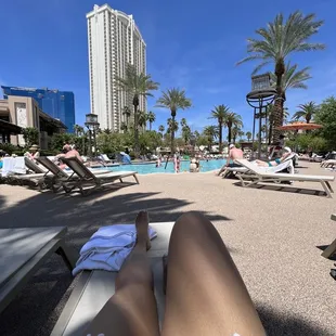 In the summer this place is both wonderful and terrible. Wonderful in that they have a lots of pools, including a general pool, an adults only pool, a VIP guest area, and the Lazy River. I lurve the Lazy River and can stay there all day. We pay a little extra for reserved seats, that way the servers always check in on us, bring us iced water without us having to ask, and we have umbrellas for our personal usage. You need to pay to rent the tubes at the Lazy River, but I know how to float, so I don't use them. What's terrible about this place are two things. First, the vast amounts of people here. If you're a guest of any MGM property, you can pay to visit. That means in the summer this place is crazy crowded, so definitely rent a cabana or a lounge chair at an exorbitant price if you need to have some space set aside for yourself. And forget about the hot tubs- whether it's summer or winter they are filled to the brim with families and kids. The second bad thing? They have just tons of Bud and Bud Light ice buckets lining the pools, especially around the general pool and the Producer's pool and there have no one picking up once they're used. It's so bad that if you want to sit near the pool edge, you kinda have to do a little custodial work and put cans in buckets, stack buckets, and gather them together somewhere away from you. It doesn't have to be like that. I go to Cancun a lot and the resorts constantly have people walking around, asking if people are done with their beverages and cleaning up so that the place doesn't look embarrassing.In spite of that, the place seems hygienically clean and it is a fun place to hang out, but if you're looking for a relaxing place to chill near the water, try an expensive indoor spa, because this place is about loud party music and it's just crawling with kids and trash.