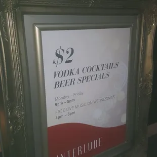 We were walking by and saw a sign that said 1 dollar CIROC drinks. We thought there must be a catch, but decided to check it out anyway. There wasn't! These drinks were large and in charge. They weren't tiny baby drinks, they were very big. Unfortunately, i was so full from dinner i could only drink one. Next time, I'm coming here before dinner to catch a buzz lolI believe the special is on sundays (maybe saturdays as well) for only an hour or two, but call to find out, because it's worth it, especially because all the drinks on or near the strip are SO expensive. Thanks interlude bar!!! We will be back!