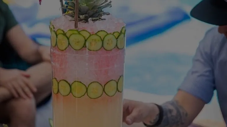 Jemaa isn't your typical rowdy dayclub. This is definitely on the chill vibe. You won't have to worry about raging splash fest in the pool (hey, watch the lash extensions please). Located in Park MGM Resort, you DO have a bit of a walk from the parking garage to the pool area. I can't even tell you the exact direction I took but all I remember I walked through a good amount of the casino floor space before I got here.As of this review, no cover charge for locals before noon. They got cabanas, day beds and lounge chairs available for rent/f&b minimum. Rates will vary depending on what kind of weekend it is. Pool is a large rectangle shaped...still a pretty good sized. Most people like to hang out on the edge of the pool anyways. We were here on a normal Sunday afternoon from 11 ish until about 3p and the entire space never felt crowded. You got your bachelorette parties, couples, group of friends...the vibe was fun. Food menu isn't your typical day club items. They went boujee here with quinoa salads, avocado toasts, falafel burgers, ceviche etc. Of course, you can still order chicken nuggets and fries if you like. Drinks come in big fancy containers topped with random objects like parrots and Barbie dolls....depending on what kind of "theme" the cocktail is.