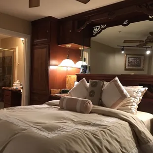 Comfortable room with an awesome large jetted tub; cute courtyard with a nice waterfall; clean and coy sheets: and fluffy white towels. LOVE this place! Dog friendly, too! Not one negative thing to say.