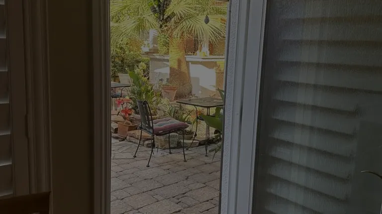 Courtyard at the bed in breakfast. Nothing better than waking up with coffee and sitting outside listening to the waterfall.