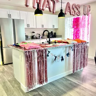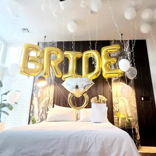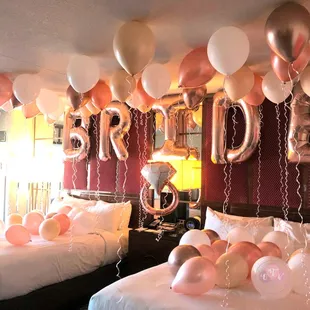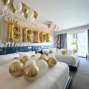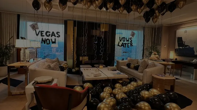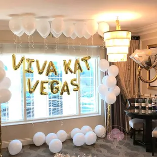 Rose gold, gold, and white bachelorette backdrop setup in the Cosmopolitan suite.
