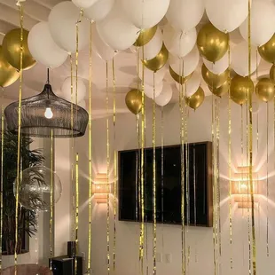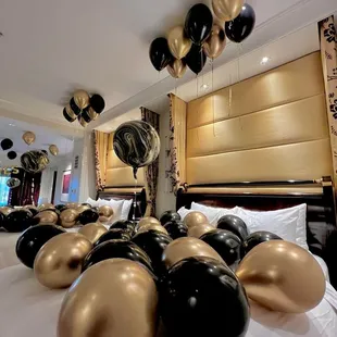 Gold & Lace 60 floor and 100 ceiling balloons setup in the Venetian hotel.