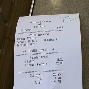 I struggled finding good coffee while staying on the Las Vegas Strip. I wanted to try local spots and not just stick with Starbucks since I was on vacation. I originally was at the Bellagio patisserie but the line wasn't moving so I walked over the Palio. They have a good variety of breakfast items and drink choices. I chose the yogurt and the vanilla latte, in house as I wanted to sit on their patio and enjoy my breakfast. The yogurt came in a Togo container, I thought it would have came in a bowl. My latte came in a nice cup, but I watched the barista place her hands inside of the cup and on the rim as she was making it. The latte itself was average, but for the price (almost 9$ with tax) I thought it would have been a little bit better than average. Honestly I wish I just went to a Starbucks for the amount of money I paid.