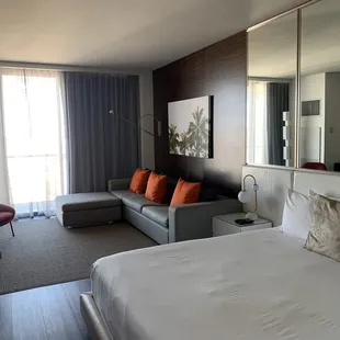 The room: we stayed in the Studio Suite Mountain View. Room was a nice size, though they've made some odd choices in terms of decor (for those of you old enough to remember, think "The Jetsons"). The bathroom is separated from the rest of the room by a frosted glass shower wall, which means that if you use the bathroom during the night, you must choose between doing so in the dark, or blasting the adjacent bed with diffused light, which your partner might not appreciate.Two televisions on the wall, side by side (immediately adjacent to each other), which also seemed odd. Would have made more sense to put one larger TV on a rack that tilts if the motive was to ensure optimal viewing from any spot.The fan in the bathroom didn't work, and the sink drained slowly (easy fixes, but if housekeeping is checking when they clean the room, guests wouldn't be left to manage this process). There were no drinking cups in the room, though they provide a role of paper towels in the little kitchen area. I presumed that housekeeping had simply forgotten to leave us an ice bucket and cups, so we returned down 27 floors back to the lobby to ask for some. There, we learned that our room refrigerator has an ice maker (empty, but time would solve that) and that no - the hotel does not provide cups. So you can have ice, but you have nothing to put it into unless you travel with cups (who does that?). We bought two souvenir cups in the small store in the lobby, but of course had no dish soap (another thing I don't pack in my suitcase) so just had to hope they were fairly sanitary and use them "as is."I have never stayed in a hotel (or motel, for that matter) that didn't provide cups - actual glasses or the disposable cups wrapped in plastic. So weird and inconvenient. After a flight that was twice delayed, during which no beverage service was offered due to the brevity of the flight, waiting for luggage, calling an Uber and navigating to the hotel, checking in...you want a drink of water. But you won't get that in this room unless you want to stick your head under the faucet. Pleasantly quiet, clean room, mattress was fine. The blackout curtains don't fully meet in the center, but that's always true for whatever reason.A short walk across their "sky bridge" takes you from Palms Place to the casino. We stayed at Palms Place because we had tickets for a show there and it seemed convenient in that regard. The theater is nice and small enough that any seat would be a good seat. I would definitely see another show there, but I might stay somewhere else.We didn't find a non-smoking area which would have been welcome, but we also didn't look that hard and could have missed it.We ate at Mabel's BBQ the first night, and my husband disliked everything on his plate. The meat was not cooked or lean enough to suit him and he thought the beans had an odd taste. He ate almost nothing and we had to go somewhere else later to get him a burger. I had the salad with sliced, fried chicken breast on top which was fine, though the restaurant could have been a little more generous with the chicken. The lime vinaigrette was a little bitter and insufficient to properly dress the salad. However, the server brought three bottles of different sauce, and I found one that worked on the salad. The cornbread was tasty and arrived as a generous loaf, which we shared and still had some to take away for a late night snack. We didn't try the hotel buffet during our stay, but did have breakfast at the Serrano Vista Cafe, which met our needs. They were happy to honor my requested substitutions, and the server was friendly. There is a small bakery counter there which I wish I had discovered prior to our last morning, as I would have given that a try.The staff we interacted with throughout the hotel, casino, and restaurants were pleasant and helpful. Plenty of security around, if that's a concern for you. They were pretty consistent in checking room keys before allowing access to the elevators.All in all, it was OK. What I'll remember from this trip is the Babyface show (excellent, but I can't really credit the hotel/casino for that - it was the same, excellent Babyface show I'd seen a few months prior at the Yaamava in Highland, California) and that after a long day of traveling, we had to trek down to the lobby to get a plastic cup. I can't imagine that that is the takeaway that management wants, so I'd suggest rethinking that strategy.