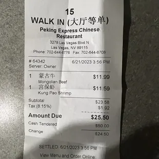 First time here , live around the neighborhood. Stopped by, knowing not what to expect. Hole in the wall , strip mall restaurant, no dine in, take out only. They have a premade Chinese food line steam tables. Decided to order fresh made wok entrees. Mongolian Beef $11.99 &King Pao Shrimp $11.59. Told by friendly cashier & server, pick up would be about 15 minutes.A few drop in customers, ordered thru the steam tables. Food arrived nicely packaged inStyrofoam containers, asked for and received yellow mustard, soy sauce prepackaged & hot sauce. Napkins & plastic folks & spoons added. At home , presently surprised the food presentation was nice, containers full & the dishes hot & tasty! A good find, reasonable prices & good take outfor fresh wok made food . Limited menu, but sufficient for a fresh hot meal to go! White rice included!