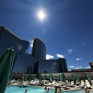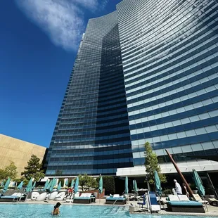 The pool at Vdara is quite nice, spacious with attentive lifeguards on duty. They offer towel service and have a cocktail bar, which adds to the overall great service. There's also a hot tub, making it a relaxing spot to unwind.