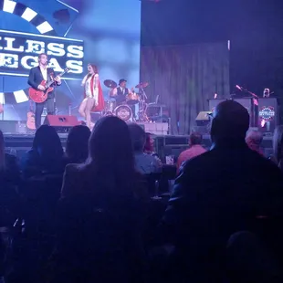 Fun tribute show in the Sahara Theatre at the Sahara in Vegas. The theater has tables rather than simply rows of seats. There is table service at this show or you can get your own drink at the bar. Show features a live band, two dancers and a couple singers reimagining classic Rat Pack era songs as rock (reminds me more of ska than hard rock if that's what you're imagining when you hear "rock.")I was seated in the center front row. Unfortunately the volume is way too loud for this venue. The table next to us got up and moved further back and I wish my husband and I had done the same. I saw this show 20 days ago and my right ear still hurts after seeing this show. I'm not being funny, bring ear plugs to protect your hearing. I wish I had.