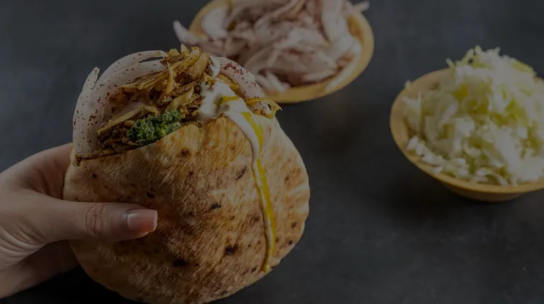 a hand holding a pita sandwich